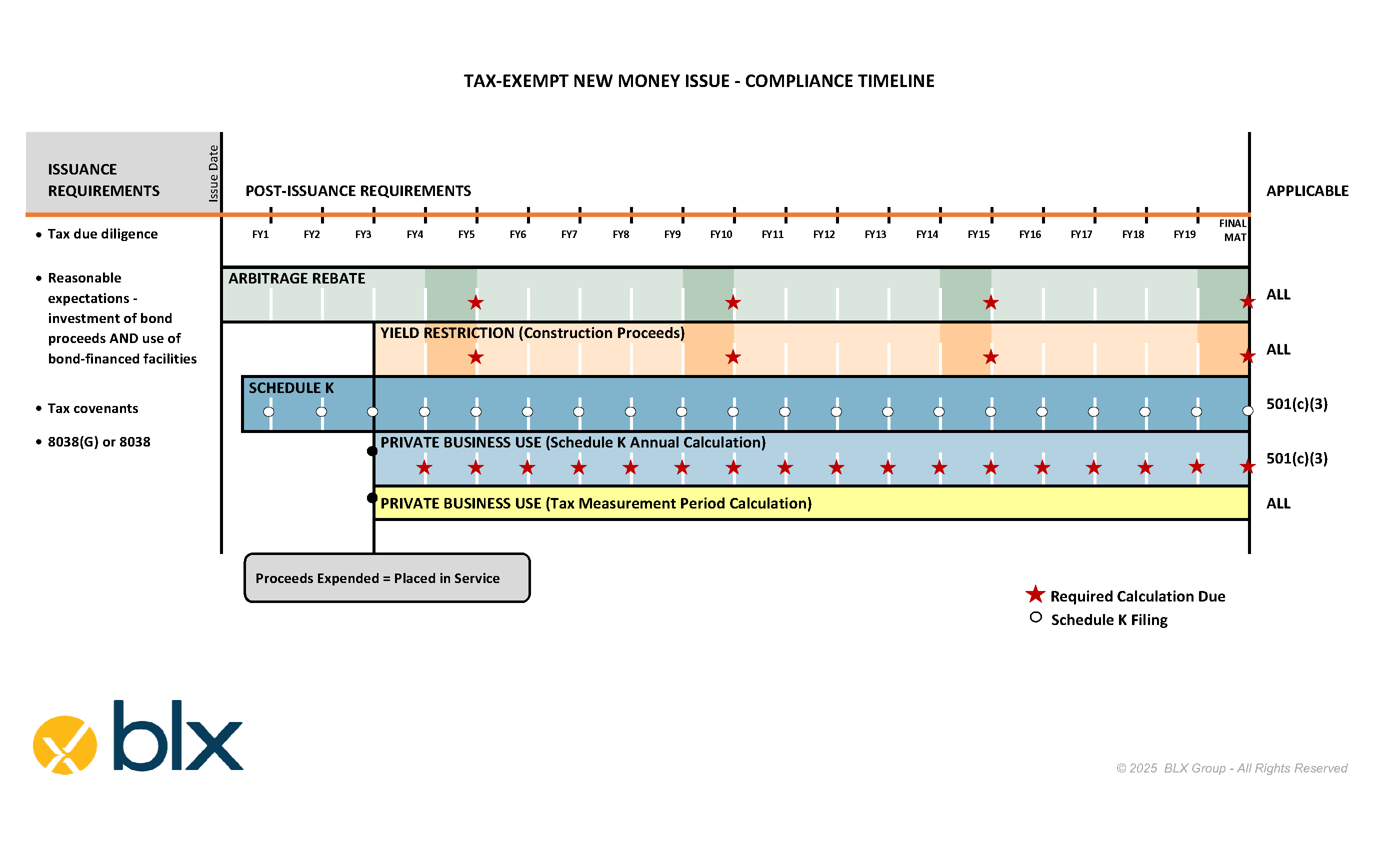 Tax-exempt bonds have numerous filing requirements and deadlines issuers and borrowers must comply with over the life of the bonds. The below timeline highlights compliance milestones related to arbitrage rebate compliance, private business use, and Schedule K filings (for nonprofit organizations).